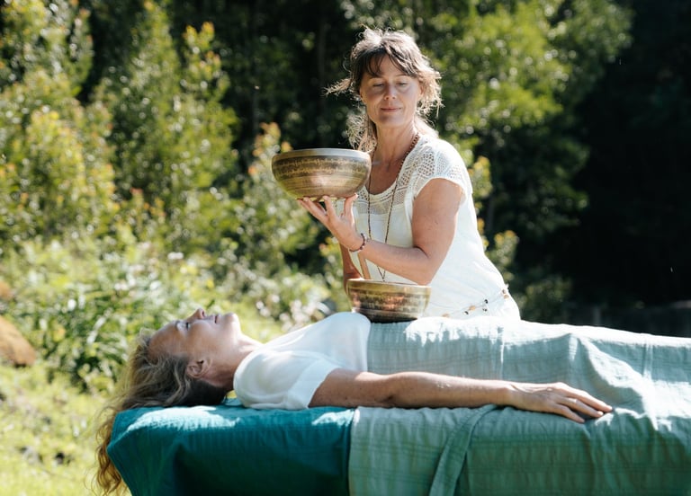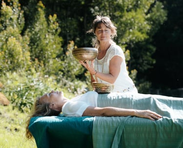 surrounded by bird song & a soft breeze. Depending on your preference, a horse will be present to deepen your relaxation and experience, whilst I gently place and activate the healing singing bowls above, under or on your body (as you wish).